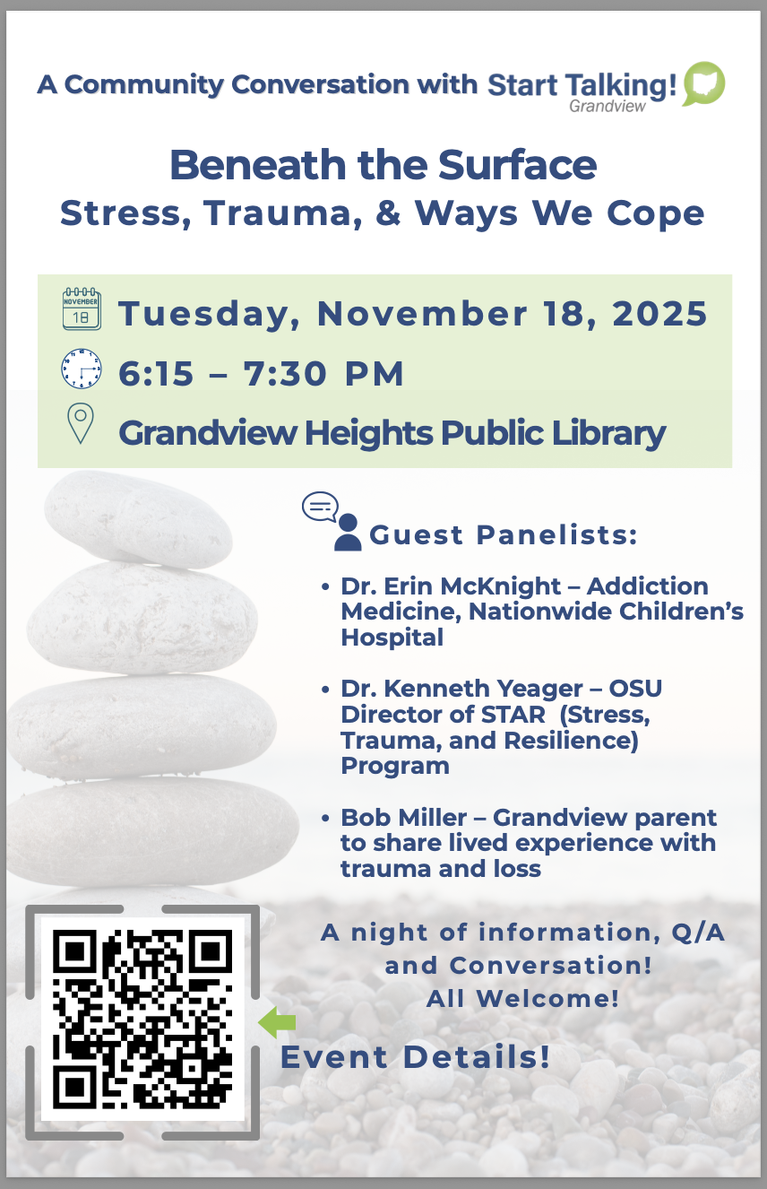 Join Start Talking Grandview for an evening of insight and dialogue on Tuesday, November 18, from 6:15 to 7:30 p.m. at the Grandview Heights Public Library for Beneath the Surface: Stress, Trauma, & Ways We Cope. Gain a deeper understanding of how early experiences impact the brain, body, and behavior; how stress and trauma can be passed between generations; and how we can parent and live with intention using healthy coping strategies.