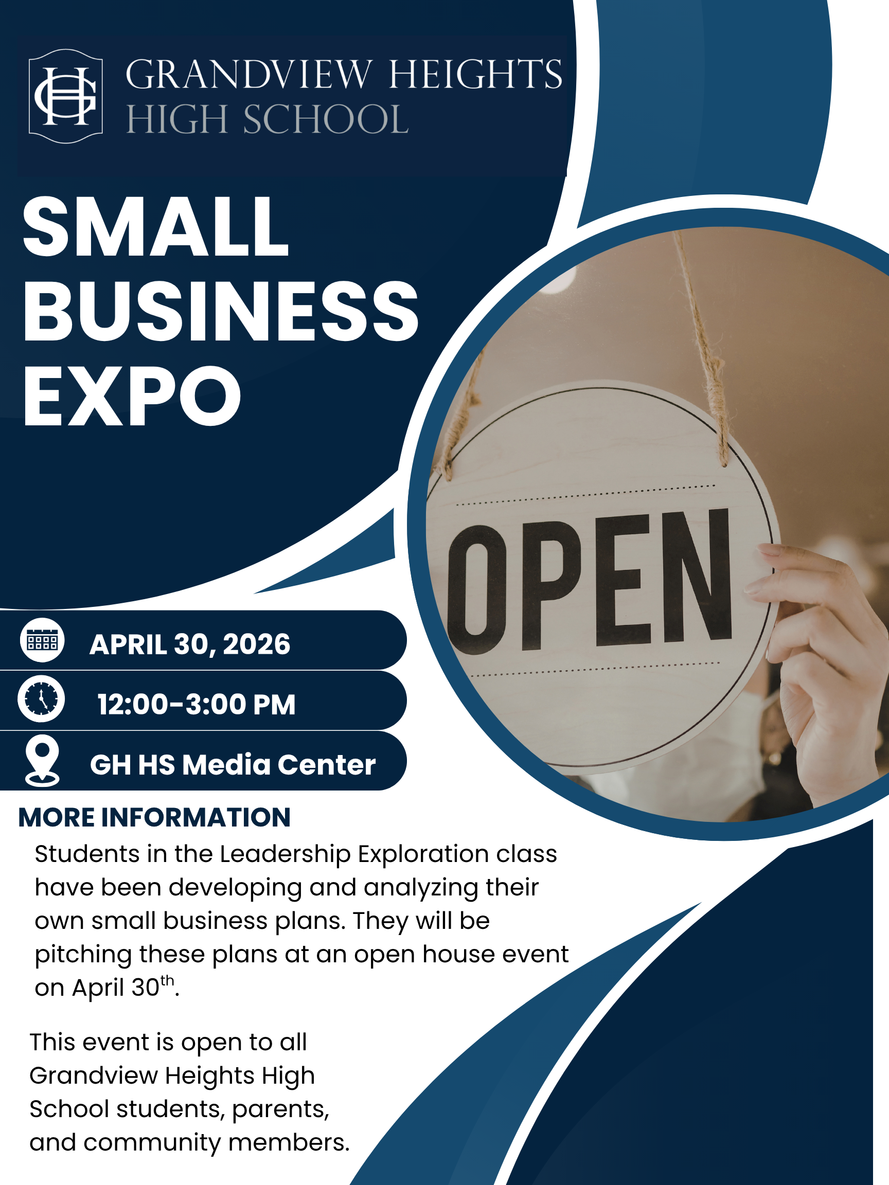 On Thursday, April 30, 2026, from 12 to 3 p.m. Grandview Heights High School students enrolled in teacher Noah Grissett's Leadership Exploration class will share their small business plans at an open house event. Students have been researching, developing, and analyzing their own small business plans with the support of staff and community members.